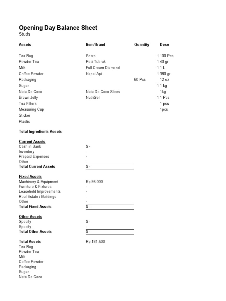 opening day balance sheet xlsx opening day balance sheet total